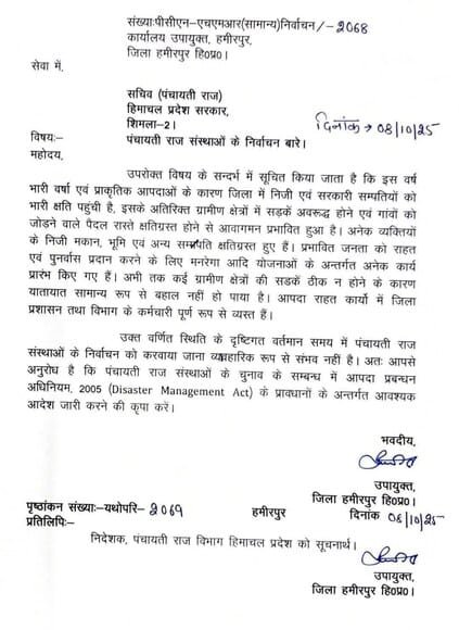 हिमाचल प्रदेश में पंचायत चुनाव से जुड़ी हुई बड़ी खबर है। हमीरपुर जिले के डीसी पंचायती राज विभाग के सचिव को पत्र लिखकर चुनाव देरी से करवाने का अनुरोध किया है। ऐसे में बड़ा सवाल उठ रहा है कि क्या हिमाचल प्रदेश में पंचायतों के चुनाव कुछ समय के लिए टाले जाएंगे?