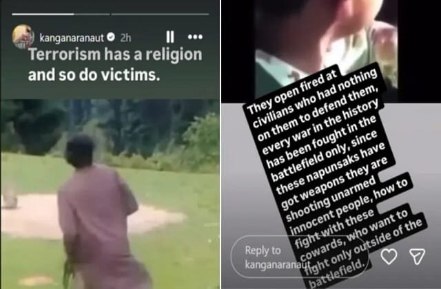 इस बीच, बॉलीवुड अभिनेत्री व बीजेपी एमपी कंगना रनौत ने भी इस आतंकी हमले पर अपनी प्रतिक्रिया दी है। कंगना ने अपने इंस्टाग्राम पर इस हमले की एक तस्वीर साझा करते हुए लिखा, “आतंकवाद का धर्म होता है और पीड़ितों का भी।” इसके बाद कंगना ने एक और पोस्ट शेयर किया, जिसमें पीड़ितों का एक वीडियो था।