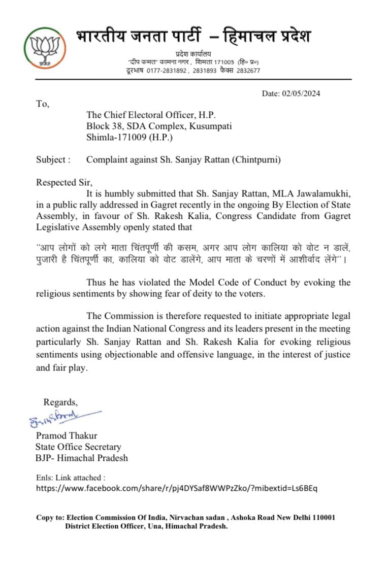 दरअसल, इस जनसभा में ज्वालामुखी के कांग्रेस विधायक संजय रतन ने मंच से माता चिंतपूर्णी की कसम देकर वोट की अपील की। अब भाजपा ने कांग्रेस के प्रत्याशी राकेश कालिया के लिए धार्मिक तौर पर वोट मांगने पर कड़ा एतराज जाहिर किया है।