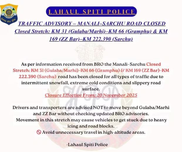 लाहौल-स्पीति पुलिस ने बॉर्डर रोड ऑर्गेनाइजेशन से ली गई जानकारी के आधार पर बताया कि 20 नवंबर से मनाली–सरचू मार्ग को पूरी तरह बंद कर दिया जाएगा। एडवाइजरी के अनुसार, रोहतांग पास के लिए गुबाला या फिर मढ़ी से आगे आवाजाही नहीं होगी।