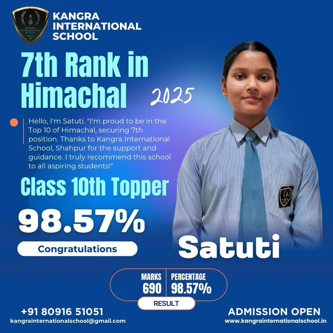 कांगड़ा, हिमाचल प्रदेश: कांगड़ा इंटरनेशनल स्कूल – शाहपुर को गर्व है कि उनकी होनहार छात्रा सतुति ने 10वीं बोर्ड परीक्षा में शानदार प्रदर्शन करते हुए 700 में से 690 अंक (98.57%) प्राप्त कर हिमाचल प्रदेश में सातवां स्थान हासिल किया है। सतुति पूरे राज्य की टॉप 10 छात्रों में शामिल हुई हैं, जो स्कूल के लिए एक ऐतिहासिक उपलब्धि है।