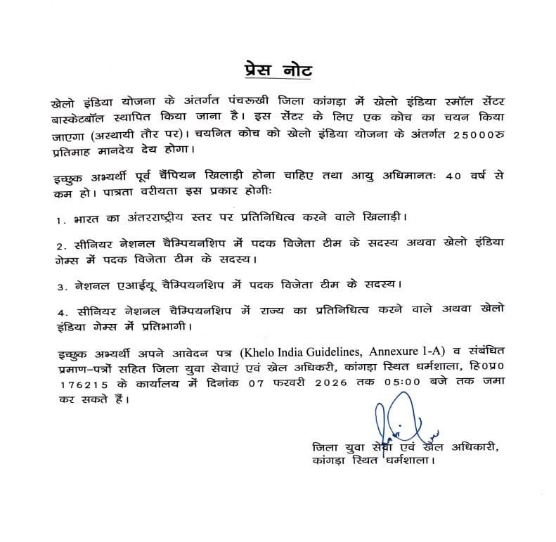 कोच के पद के लिए आयु सीमा 40 वर्ष से कम रखी गई है, हालांकि पात्र मामलों में आयु में छूट दी जा सकती है। चयनित कोच को खेलो इंडिया योजना के तहत 25 हजार रुपये प्रतिमाह मानदेय प्रदान किया जाएगा। इच्छुक एवं पात्र उम्मीदवार अपने आवेदन पत्र के साथ आवश्यक प्रमाण पत्र संलग्न कर जिला युवा सेवाएं एवं खेल अधिकारी, कांगड़ा (धर्मशाला) के कार्यालय में 07 फरवरी 2026 को सायं 5 बजे तक जमा कर सकते हैं।