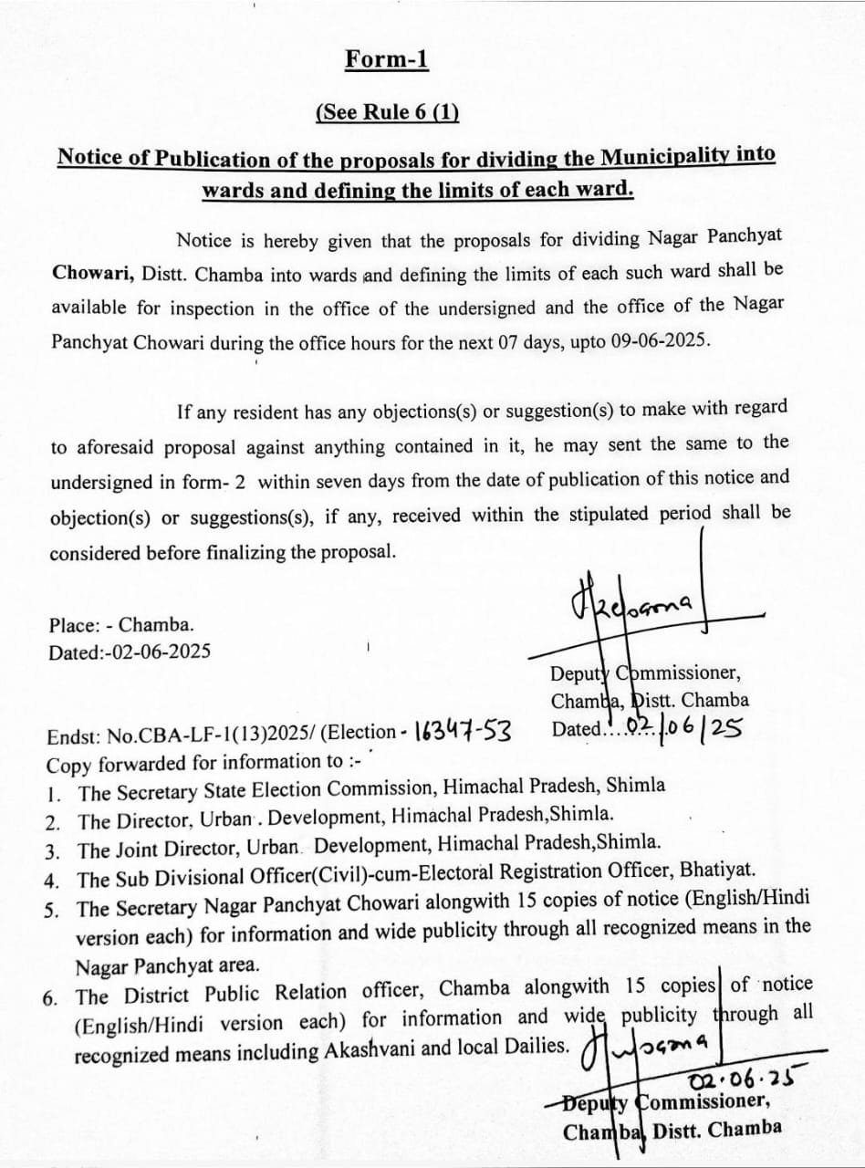 उपायुक्त चंबा मुकेश रेपसवाल ने इस संबंध में सूचना जारी करते हुए बताया कि नगर परिषद चंबा व डलहौजी तथा नगर पंचायत बनीखेत व चुवाड़ी को वार्डों में विभाजित करने तथा प्रत्येक वार्ड की सीमा निर्धारित करने के प्रस्ताव 9 जून 2025 तक कार्यालय अवधि के दौरान उपायुक्त कार्यालय चंबा तथा संबंधित नगर परिषदों/नगर पंचायतों (नगर परिषद चंबा व डलहौजी तथा नगर पंचायत बनीखेत व चुवाड़ी) के कार्यालयों में निरीक्षण के लिए उपलब्ध रहेंगे।