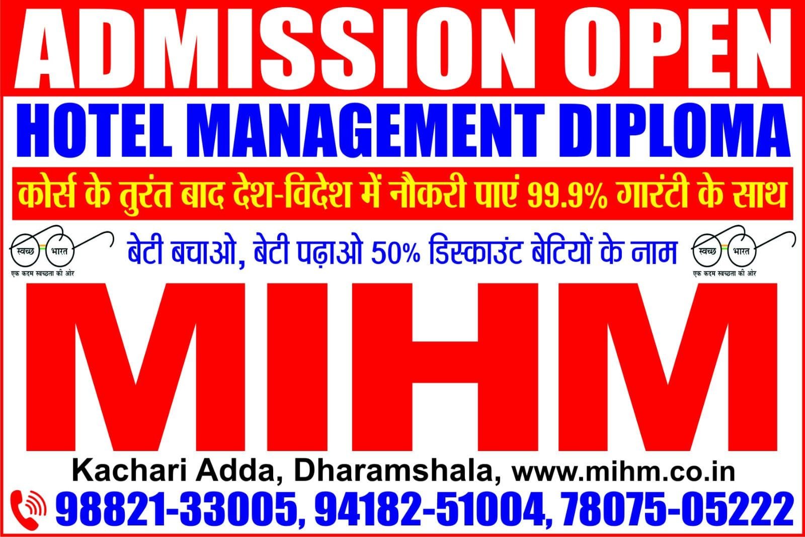 आपको जानकर बड़ी खुशी होगी की अब आपके शहर धर्मशाला में होटल मैनेजमेंट का MIHM (Master’s institute of Hotel Management) इंस्टिट्यूट खुला है, जिसमे आपको पढ़ाई के साथ साथ नौकरी का सुनहरा मौका मिल रहा है। जहां पर देश और विदेश में भी नौकरी कर सकते है ।