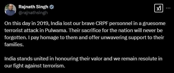 रक्षा मंत्री राजनाथ सिंह ने शहीदों को श्रद्धांजलि दी है। उन्होंने पोस्ट शेयर करते हुए लिखा कि 2019 में आज ही के दिन भारत ने पुलवामा में हुए भीषण आतंकवादी हमले में अपने बहादुर सीआरपीएफ जवानों को खो दिया था। देश के लिए उनके बलिदान को कभी नहीं भुलाया जा सकेगा।