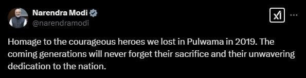 पुलवामा आतंकी हमले की छठी बरसी पर पीएम मोदी ने देश के वीर सपूतों को याद किया है। उन्होंने सोशल मीडिया ‘एक्स’ पर वीर शहीद जवानों को श्रद्धांजलि देते लिखा कि 2019 में हमने जिन वीर जवानों को खोया उन्हें शत-शत नमन। आने वाली पीढ़ियां उनके बलिदान और राष्ट्र के प्रति उनकी अटूट समर्पण भावना को कतई नहीं भूलेगी।