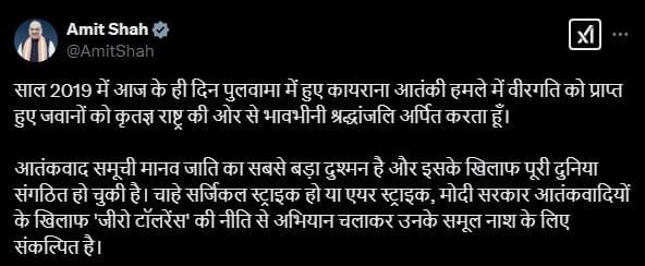 इस मौके पर गृह मंत्री अमित शाह ने भी शहीद जवानों को नमन किया है। उन्होंने सोशल मीडिया ‘एक्स’ पर लिखा कि मोदी सरकार जीरों टॉलरेंस की नीति पर हमेशा कायम है और देश से आतंकवाद के खात्मे के लिए संकल्पित है। उन्होंने 2019 में पुलवामा आतंकी हमले को कायराना बताया।