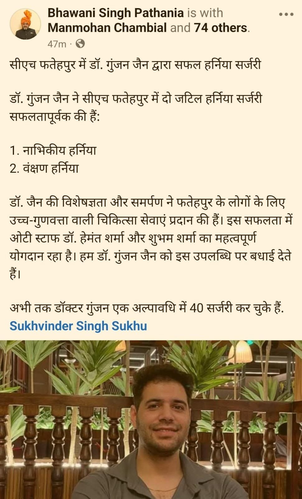 विधायक एवं राज्य योजना बोर्ड के उपाध्यक्ष भवानी सिंह पठानिया ने भी अस्पताल की प्रशंसा करते हुए सोशल मीडिया पर लिखा कि डॉ. जैन ने दो जटिल हर्निया ऑपरेशन (नाभिकीय और वंक्षण) सफलतापूर्वक किए हैं। इस उपलब्धि में ओटी स्टाफ डॉ. हेमंत शर्मा और शुभम शर्मा का भी विशेष योगदान रहा।