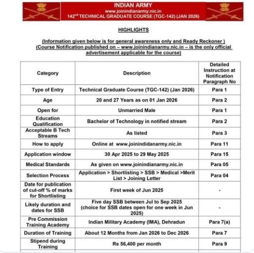 क्या आप इंजीनियरिंग ग्रेजुएट हैं और देश की सेवा करने का सपना देखते हैं? यदि हां, तो इंडियन आर्मी आपको टेक्निकल ग्रेजुएट कोर्स (TGC 142) – जनवरी 2026 के माध्यम से यह अवसर प्रदान कर रही है। 30 अप्रैल 2025 से ऑनलाइन आवेदन शुरू हो चुके हैं, और 29 मई 2025 को दोपहर 3:00 बजे तक इंडियन आर्मी की वेबसाइट https://www.joinindianarmy.nic.in पर जाकर आवेदन किया जा सकता है।