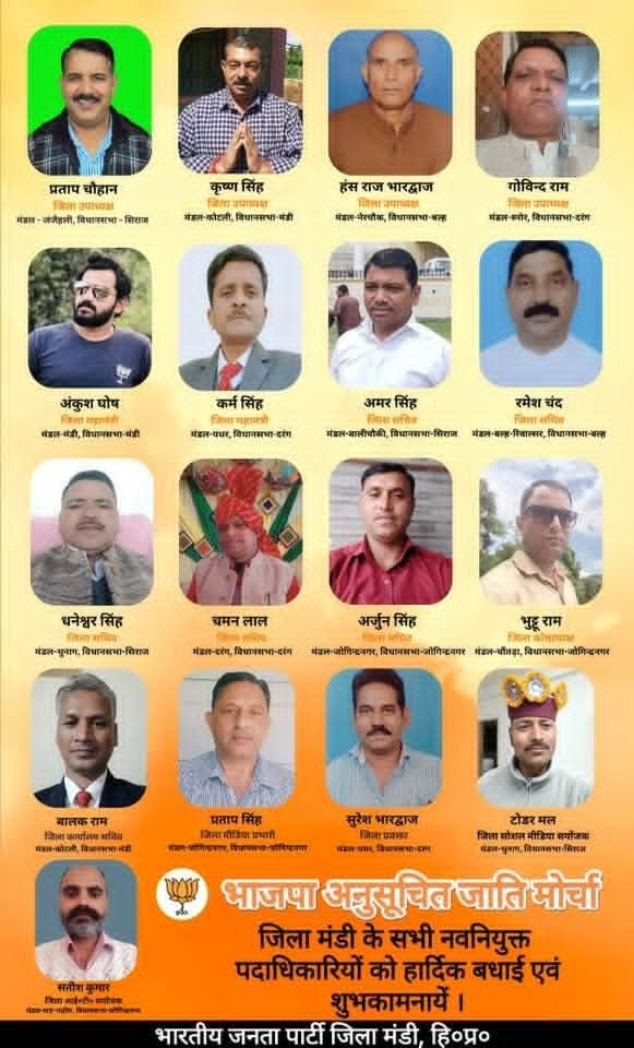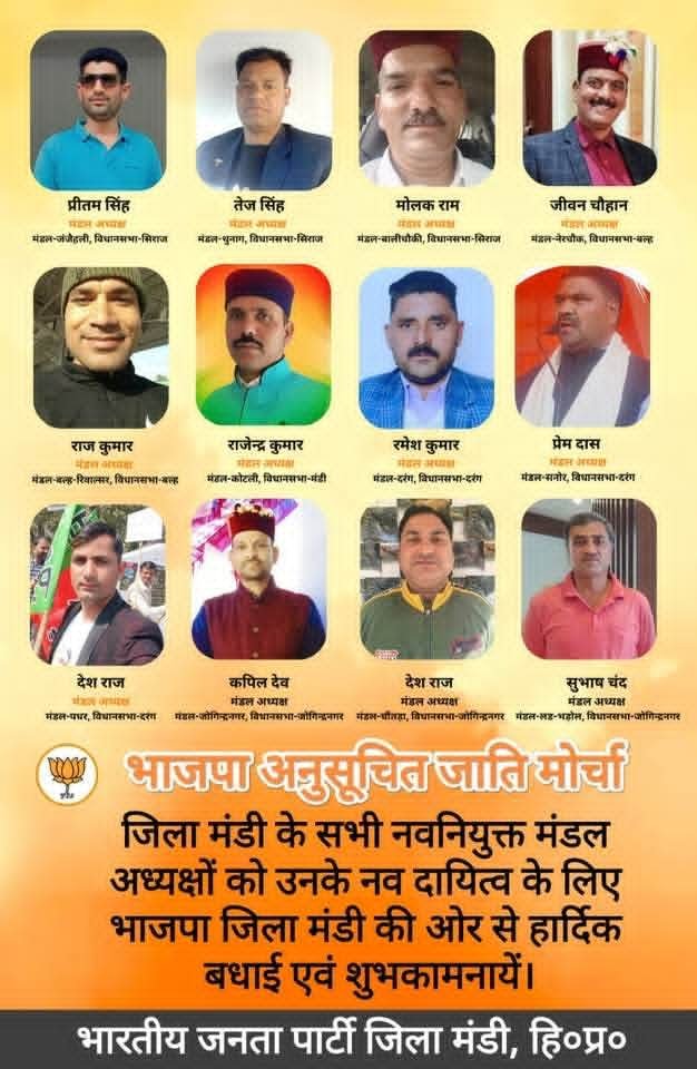 भाजपा अनुसूचित जाति मोर्चा की बैठक में पूर्व मुख्यमंत्री एवं नेता प्रतिपक्ष जय राम ठाकुर भाजपा प्रदेश अनुसूचित जाति मोर्चा, प्रदेश अध्यक्ष मनीष चौहान, भाजपा जिला मंडी अध्यक्ष निहाल चंद शर्मा व सभी 13 मंडलों के मंडल अध्यक्षों सहित विचार विमर्श करने के उपरांत भाजपा अनुसूचित जाति मोर्चा जिला मंडी अध्यक्ष खेम चंद संध्याना ने सर्वसम्मति से