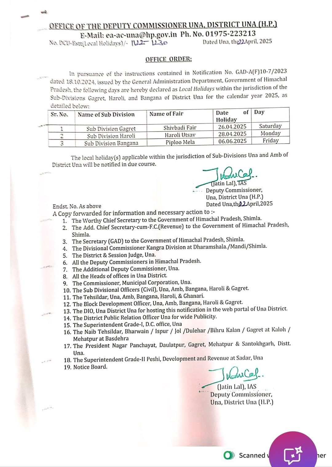 इसके अतिरिक्त जिला ऊना के उपमंडल ऊना और अंब के अधिकार क्षेत्र में आने वाले क्षेत्रों के लिए भी मेलों या अन्य स्थानीय आयोजनों के अवसर पर अवकाश की अधिसूचना यथासमय जारी की जाएगी। प्रशासन ने स्पष्ट किया है कि ऐसे किसी भी अवकाश की जानकारी समय रहते अधिसूचित कर दी जाएगी ताकि स्कूल, कार्यालयों और आम नागरिकों को किसी प्रकार की असुविधा न हो।