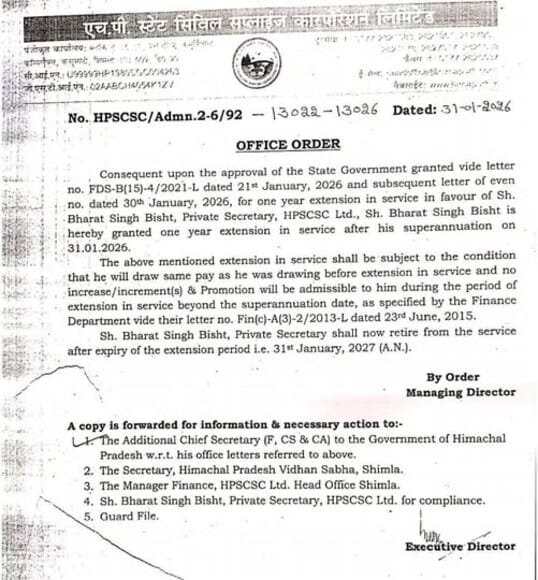 इसके अलावा, नेता प्रतिपक्ष जयराम ठाकुर के निजी सचिव भरत सिंह बिष्ट को प्रदेश सरकार ने बिजली विभाग में एक साल का सेवा विस्तार दिया है।
