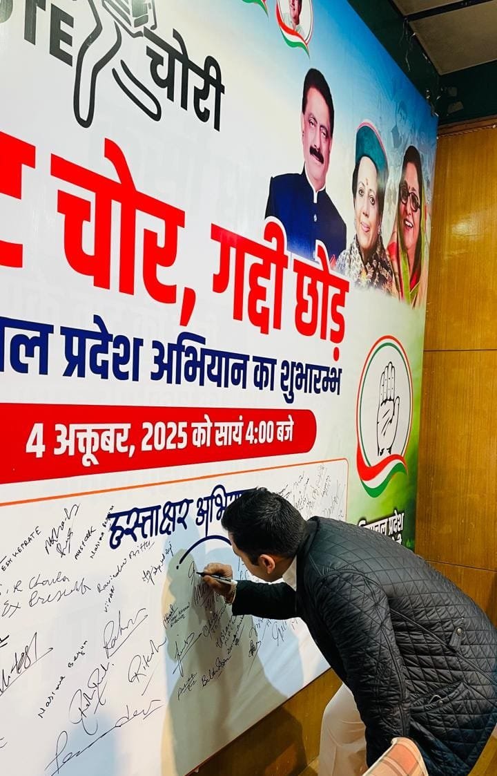 आज प्रदेश कांग्रेस मुख्यालय राजीव भवन में शिमला ग्रामीण के वोट चोर,कुर्सी छोड़ हस्ताक्षर अभियान के शुभारंभ अवसर पर विक्रमादित्य सिंह ने कहा कि राहुल गांधी के इस अभियान को सफल बनाने के लिये इस हस्ताक्षर अभियान को हर स्तर पर सफल बनाना होगा।