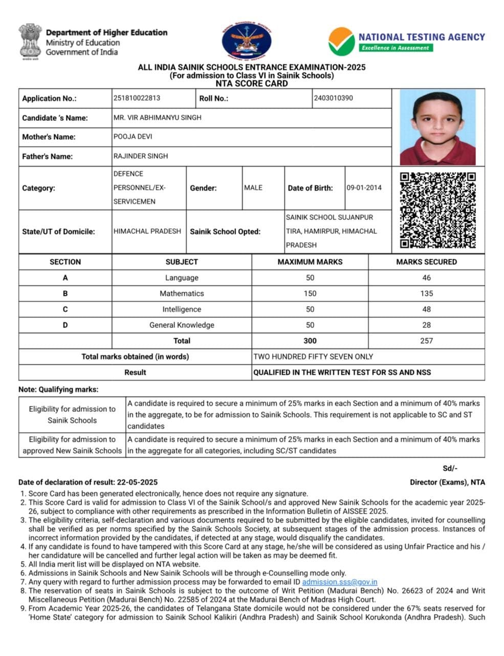 गांव थाना, तहसील हारचंकियां, जिला कांगड़ा के श्री राजिंदर सिंह (राजिंदर सिंह जस्सी) के पुत्र वीर अभिमन्यु सिंह ने ऑल इंडिया सैनिक स्कूल प्रवेश परीक्षा (AISSEE) 2025 में 300 में से 257 अंक प्राप्त कर एक अद्वितीय उपलब्धि हासिल की है।