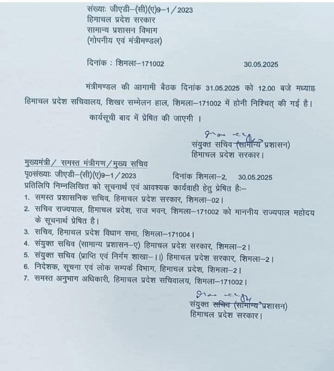 मुख्यमंत्री सुखविंद्र सिंह सुक्खू की अध्यक्षता में शनिवार दोपहर 12 बजे मंत्रिमंडल की बैठक होगी।