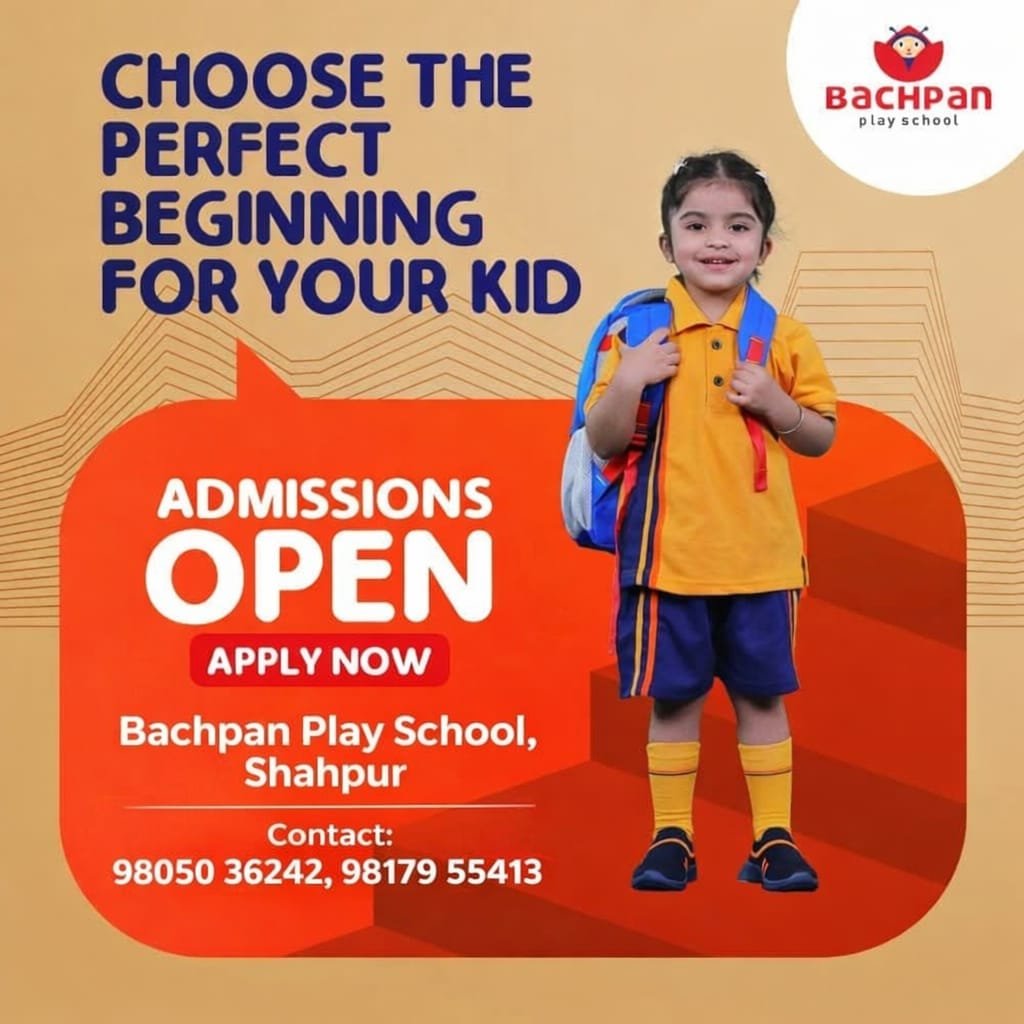 शाहपुर‌ क्षेत्र के प्रसिद्ध प्ले स्कूल Bachpan Play School, Shahpur में नए सत्र के लिए एडमिशन प्रक्रिया शुरू हो गई है। स्कूल प्रबंधन ने बच्चों के उज्ज्वल भविष्य के लिए बेहतर शिक्षा और आधुनिक सुविधाओं का भरोसा दिलाया है।