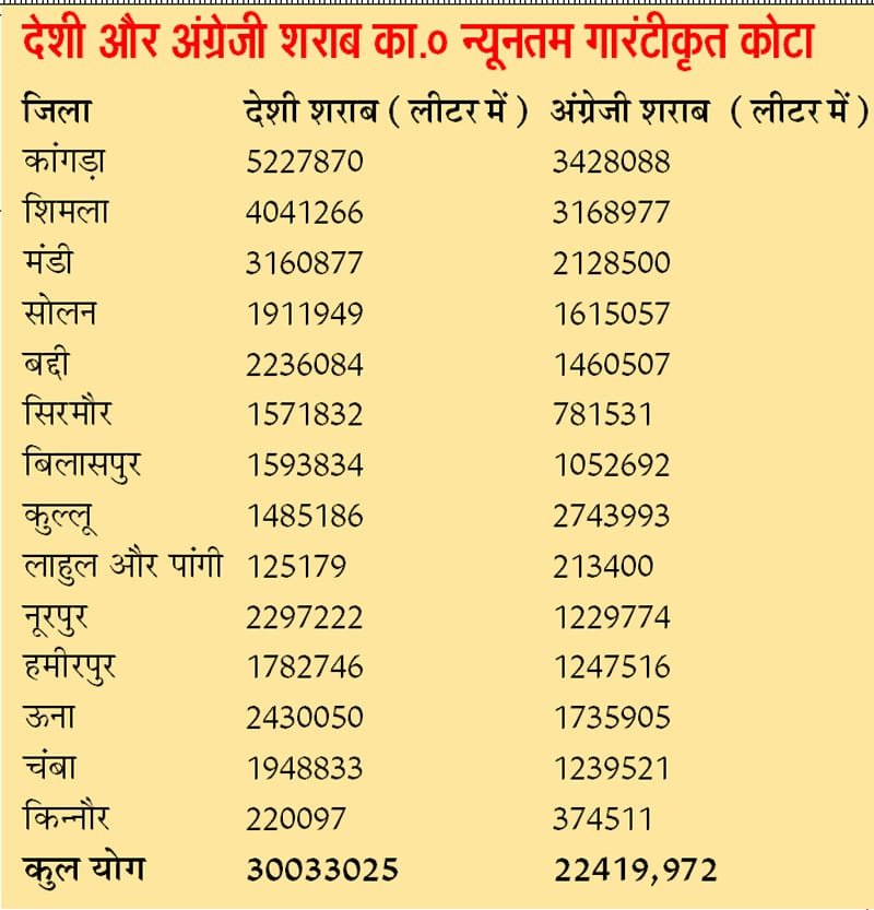 देशी शराब की बात करें, तो कांगड़ा में 52 लाख 27 हजार 870 लीटर, शिमला में 40 लाख 41 हजार 266 लीटर और मंडी में 31 लाख 60 हजार लीटर शराब बिक्री का लक्ष्य तय किया गया था।