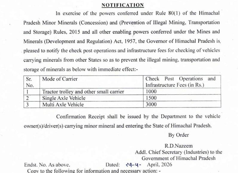 जानकारी के अनुसार, हिमाचल प्रदेश के इंडस्ट्री विभाग की तरफ से ये आदेश जारी किए गए हैं। सरकार ने अन्य राज्यों से हिमाचल प्रदेश में खनिज लाने वाहनों पर चेक पोस्ट संचालन और इंफ्रास्ट्रक्चर शुल्क लागू किया है।