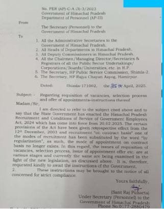 इस पत्र में कहा गया है कि राज्य सरकार ने क्योंकि कर्मचारी सेवा शर्तें एक्ट 2024 पारित कर दिया है, जिसे 20 फरवरी 2025 से पूरी तरह लागू कर दिया गया है। इस एक्ट के कुछ प्रावधान 12 दिसंबर 2003 से लागू हो रहे हैं, जिसके तहत अनुबंध नियुक्तियों को हटाकर अब सिर्फ रेगुलराइजेशन का ही प्रावधान है। इसलिए सभी विभागों को निर्देश दिए जा रहे की नियुक्तियां नए सिरे से देने से पहले राज्य सरकार की ओर से जारी किए जाने वाले नए निर्देशों का इंतजार करें।