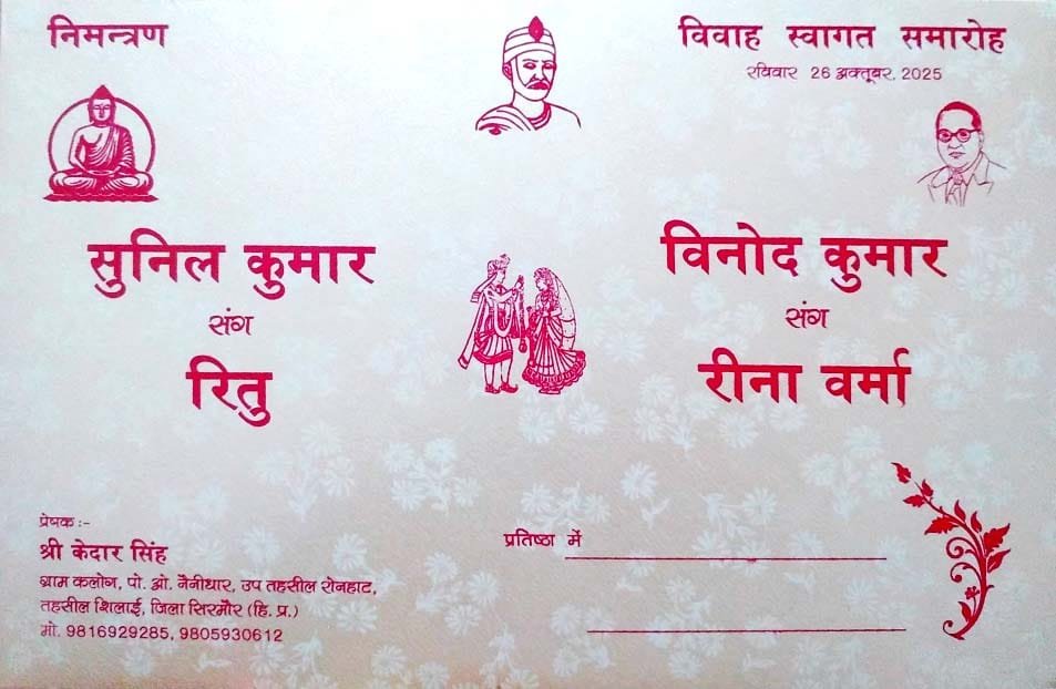 न फेरे, न पंडित, और न 7 वचन। जी हां जिला सिरमौर में एक बार फिर एक अनोखी शादी देखने को मिली है। अब 2 भाइयों ने संविधान को साक्षी मानकर विवाह किया है। बाबा साहेब से प्रेरणा लेकर इन 2 भाइयों ने एक अलग मिसाल पेश की है।