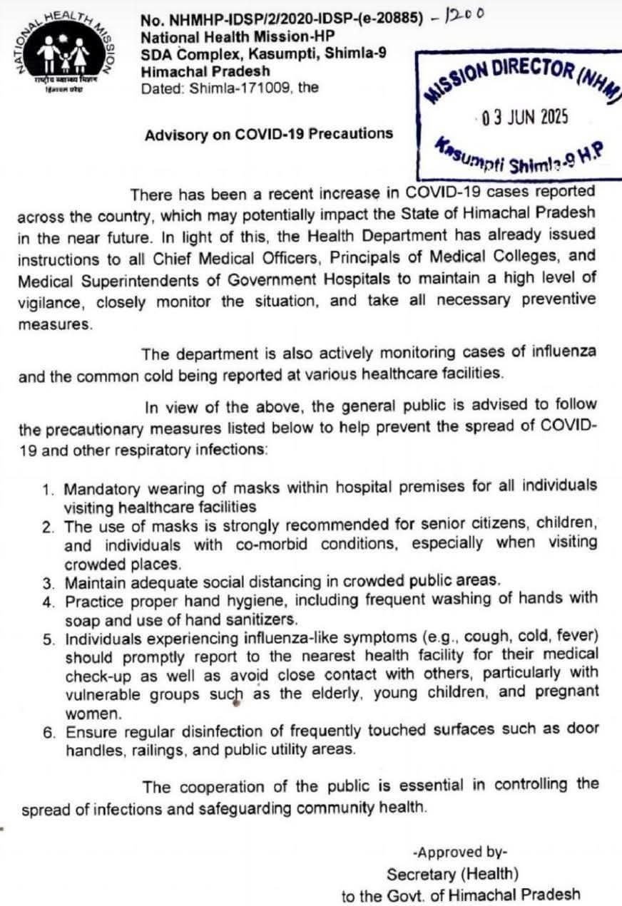 ऐसे में हिमाचल में कोरोना का पहला मामला दर्ज किया गया है। जिसको लेकर अब सरकार अलर्ट मोड में आ गई है। ऐसे में राष्ट्रीय स्वास्थ्य मिशन, हिमाचल प्रदेश ने एक नई एडवाइजरी जारी की है। देशभर में COVID-19 मामलों में वृद्धि के कारण राज्य में भी संक्रमण फैलने की संभावना जताई जा रही है।